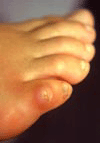 Corns appear as a horny thickening of the skin on the toes. This thickening appears as a cone shaped mass pointing down into the skin. Hard corns are usually located on the outer surface of the little toe or on the upper surface of the other toes, but can occur between the toes. A soft corn occurs between the toes and are kept soft by the moisture in this area. A callus is more diffuse area of thickening and does not have the focal point of the corn. Ingrid has special tools to remove the corn. | | | A corn on the outside of the |